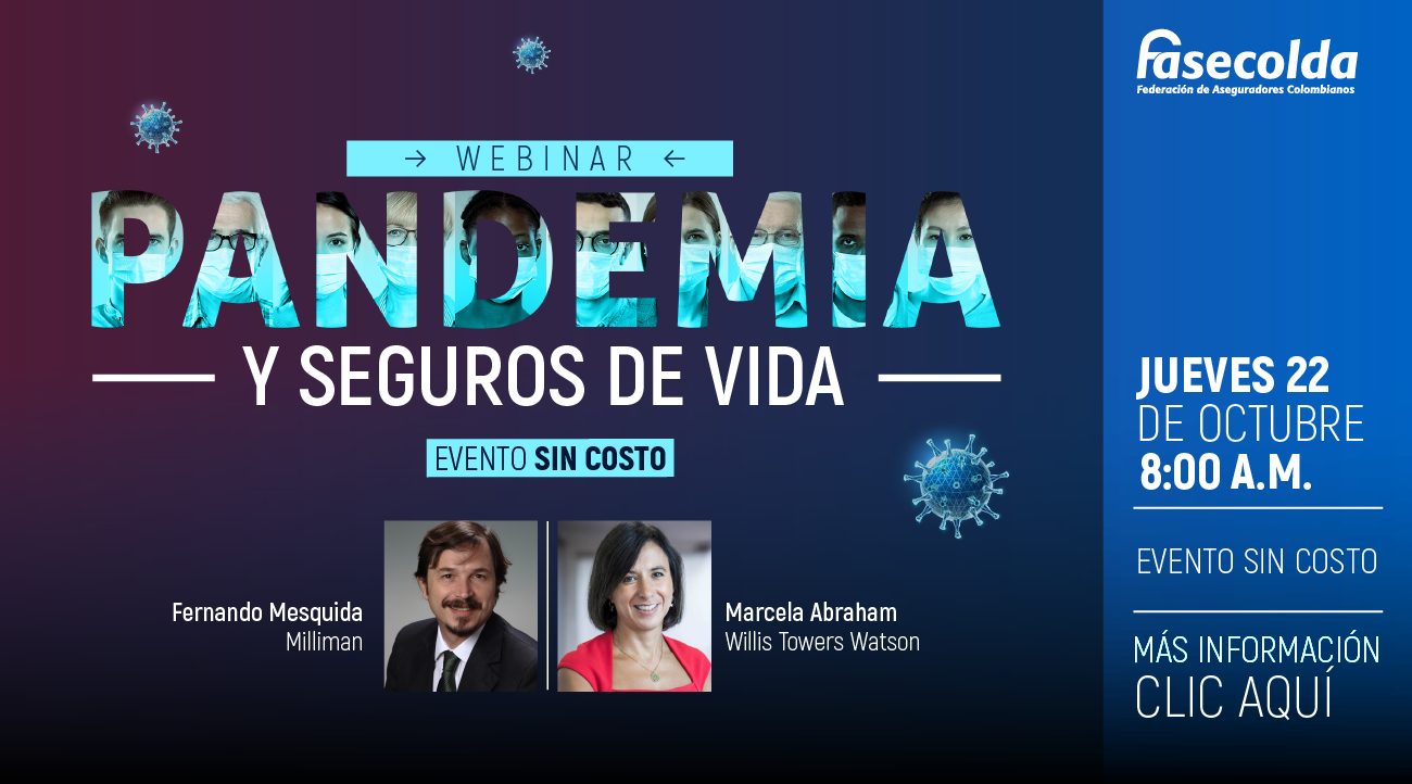 Con el ánimo de generar un espacio de reflexión y análisis que permita dar una mirada integral a los efectos de la pandemia en los seguros de Vida y Personas, Fasecolda organiza el webinar ‘Pandemia y seguros y vida’, que se desarrollará el próximo jueves 22 de octubre, a partir de las 8:00 a.m.