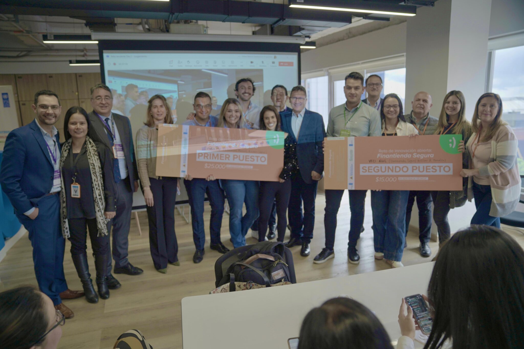 El segundo lugar fue para el equipo de Seguros Bolívar, Daviplata y Fenalco, con su propuesta «Veci Ágil», que busca fortalecer la sostenibilidad de los pequeños comercios mediante un préstamo rotativo con desembolsos directos a proveedores y un seguro paramétrico para proteger contra riesgos climáticos. Esta solución se implementará en fases, comenzando con un crédito digital para capital de trabajo.
