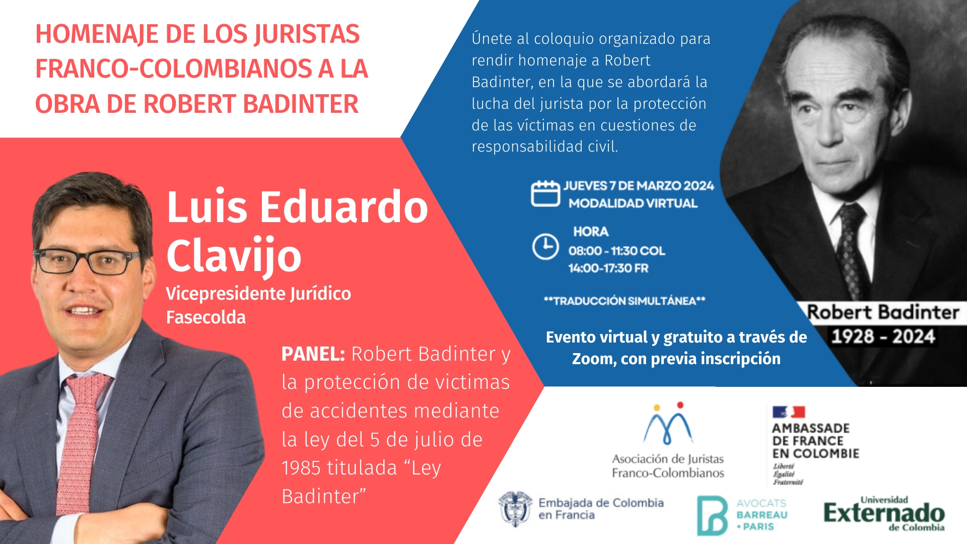 Luis Eduardo Clavijo, Vicepresidente Jurídico de Fasecolda, participará en la charla ‘Robert Badinter y la protección de víctimas de accidentes mediante la ley del 5 de julio de 1985 intitulada ‘Ley Badinter’’, en la que compartirá con Jonas Knetsch, Profesor de la Universidad Paris 1 Panthéon Sorbonne y Director del instituto de seguros de Paris y Juan Camilo Neira, Director del Departamento de Riesgos y Seguros.