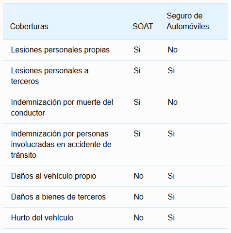 Las principales diferencias entre el seguro de automóviles y el SOAT se relacionan en la siguiente tabla:
